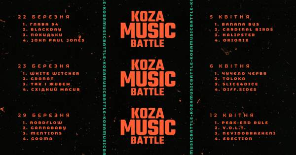 Сьомий сезон битви-конкурсу між молодими артистами Koza Music Battle цього року знову відбудеться у Тернополі. При чому, на відміну від попередніх років, етапи батлу проходитимуть п'ятницями та суботами, що буде трохи зручніше для іногородніх учасників.